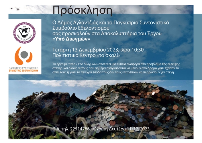 Πραγματοποιήθηκε στις 13/12/2023 εκδήλωση για τα αποκαλυπτήρια του έργου «Υπό διωγμών» στο Πολιτιστικό Κέντρο «το σκαλί» στην Αγλαντζιά από το Δήμαρχο Αγλαντζιάς, κ. Ανδρέα Κωνσταντίνου και τον Πρόεδρο του Παγκύπριου Συντονιστικού Συμβουλίου Εθελοντισμού (ΠΣΣΕ), κ. Ηλία Δημητρίου.
